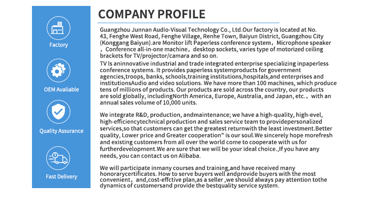 ہمارے پاس آر اینڈ ڈی ، تقسیم ، فروخت اور متعلقہ خدمات کے ساتھ ساتھ کوالٹی الیکٹرک ٹچ اسکرین ایل سی ڈی مانیٹر لفٹر پروڈکشن لائنز ، ایڈوانسڈ ایل سی ڈی اسکرین لفٹر سی این سی آلات ، ایک مضبوط ڈیزائن ٹیم اور فروخت کے بعد کی بہترین خدمت ٹیم کے لئے ایک اسٹاپ آفس فرنیچر اور سامان کے حل ہیں۔ ہمارا ایل سی ڈی اسکرین لفٹر بنیادی طور پر سینئر ایگزیکٹو ڈیسک ، بڑی کانفرنس ٹیبلز ، ہر طرح کے عیش و آرام کے ہوٹلوں ، دفتر کی عمارتوں ، لیبارٹریوں ، بینکوں ، سرکاری منصوبوں ، آفس سسٹم انضمام اور اسی طرح میں استعمال ہوتا ہے۔ ہمارا ایل سی ڈی اسکرین لفٹر 100 سے زیادہ ممالک اور شہروں کو برآمد کیا گیا ہے اور پوری دنیا میں اس کی اچھی شہرت حاصل ہے۔ ہم پختہ یقین رکھتے ہیں کہ جدید مصنوعات ، مسابقتی الیکٹرک ٹچ اسکرین LCD مانیٹر لفٹر قیمت اور کامل خدمت کے ساتھ ، چائنا جنن ایل سی ڈی اسکرین لفٹر مارکیٹ اور صارفین کو جیتنے کی کوشش کر رہا ہے ، اور بہتر کے منتظر ہے۔